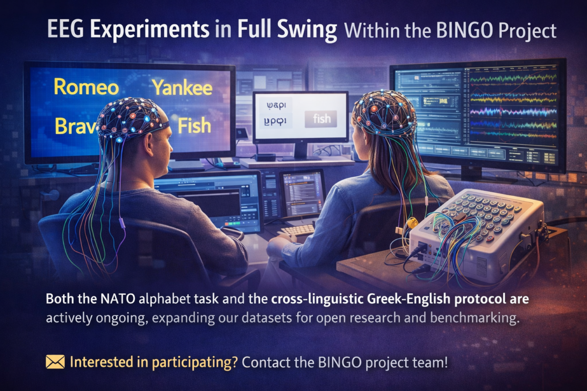 BINGO is a project that aims to develop a Brain-Computer Interface (BCI) system that can decode imagined speech (speech that is thought but not spoken). To do this, the project will use cutting-edge machine learning techniques and a carefully designed experimental protocol. The project will also investigate the potential of imagined speech as an intuitive paradigm and will explore the possibility of expanding the vocabulary of imagined speech that can be decoded. In addition, the project will release a publicly available benchmarking framework to facilitate the comparison and validation of computational methods for imagined speech decoding.