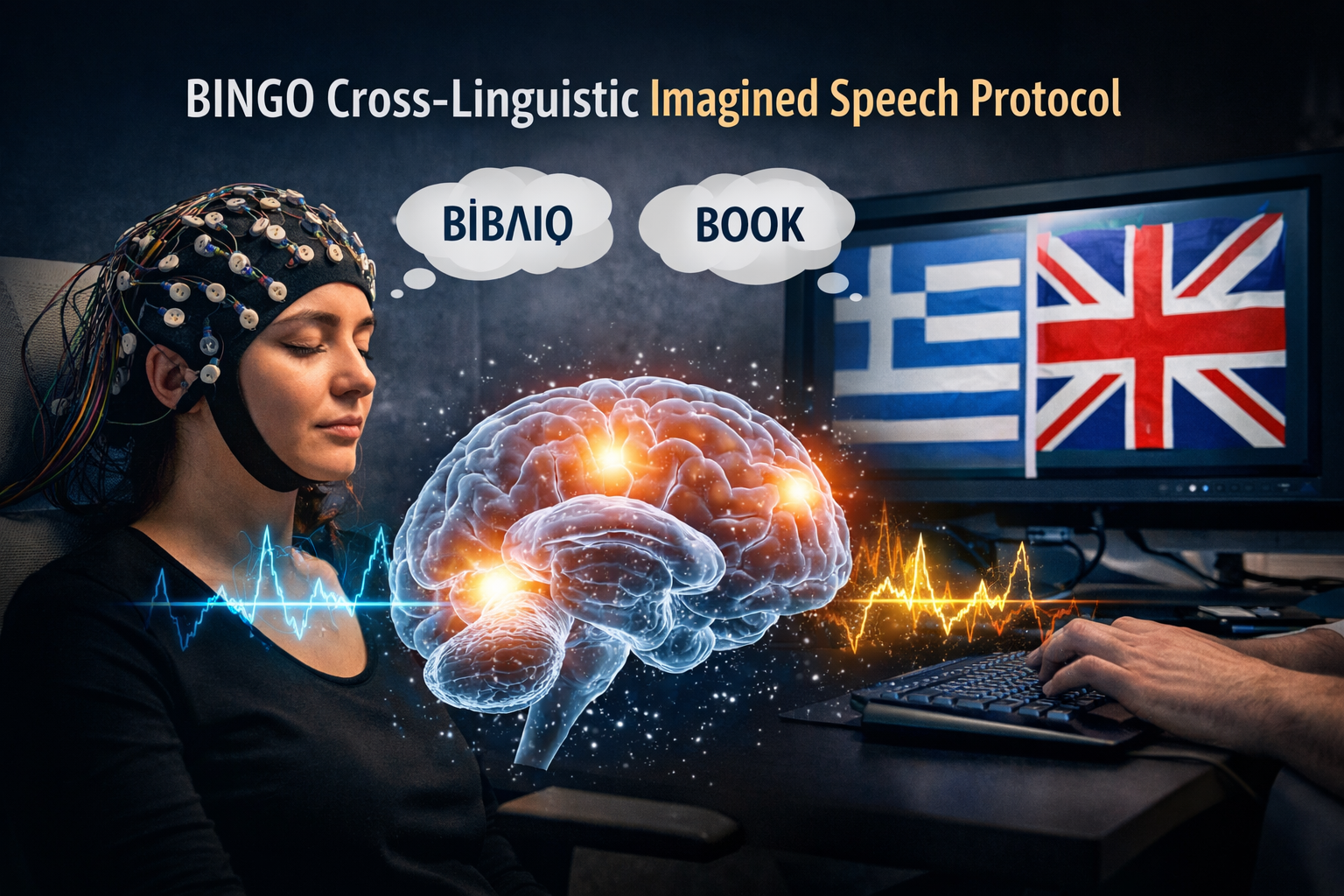 At the core of BINGO’s methodological innovation lies its cross-linguistic imagined speech protocol, specifically designed to probe how the brain encodes language across different linguistic systems. The protocol was formulated around carefully selected pairs of Greek and English words that share the same semantic meaning, enabling direct, controlled comparisons while minimizing conceptual confounds. During each trial, participants are visually prompted with a single lexical item and instructed to silently imagine articulating the word in the target language, an approach that facilitates the study of both language-dependent and language-independent neural patterns.